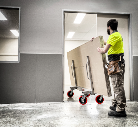 Ergonomically designed drywall cart to ensure easy manoeuvrability around the job site, able to fit through narrow spaces and in and around tight corners. They can quickly and effortlessly convert to a flatbed when required. The unit itself only weighs 22kg with a W.L.L of one ton (1000kg). The upright handles dismantle in seconds for transportation and storage and the stowed handles form a carry handle. The carts are available with two swivel lock casters.